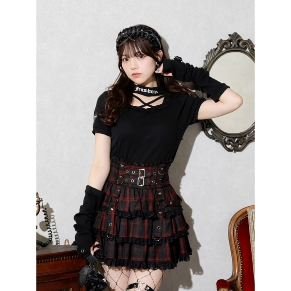 チョーカーのようなネックと胸元のクロスラインもアクセントをプラス。
