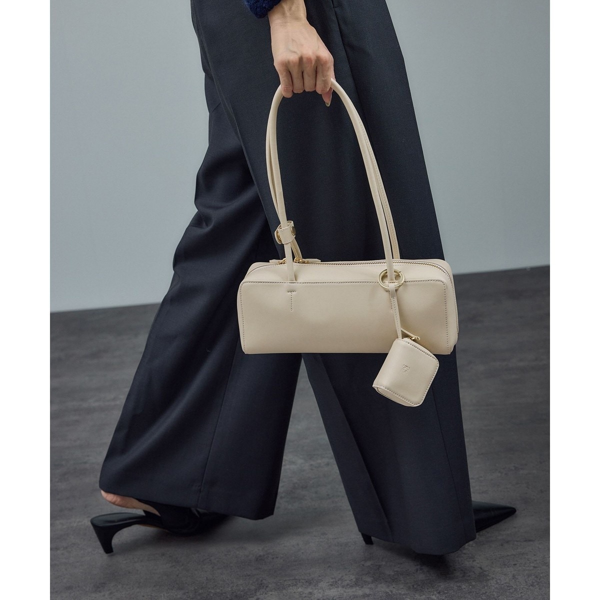 今季注目のワイドフォルム×ミニチャーム付きデザインで、トレンド感を効かせたミドルサイズショルダーバッグ。