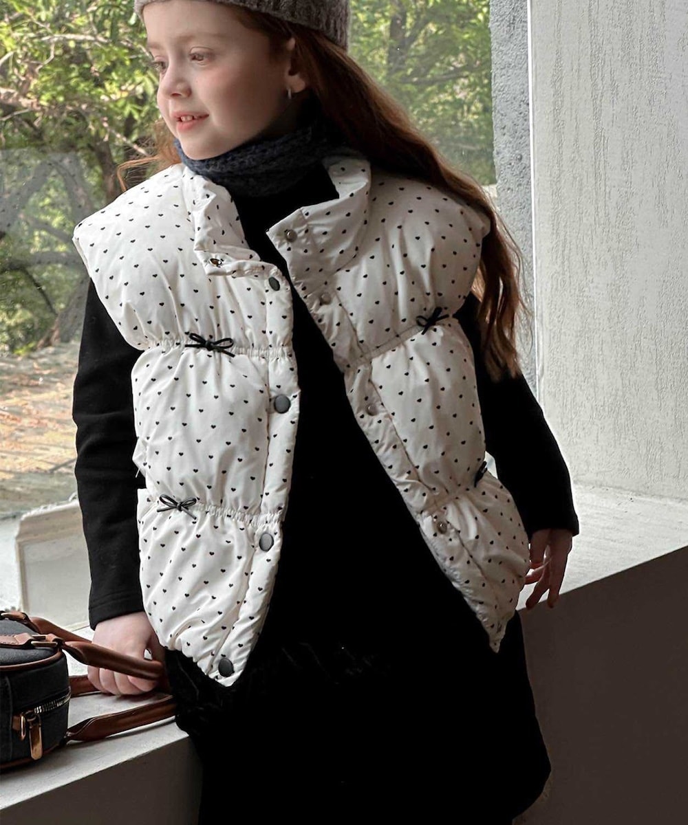 ふんわり柔らかな中綿ベストに、さりげなくあしらわれたドット柄がポイント。軽やかな着心地なのに、しっかり暖かいのがうれしい一枚です。