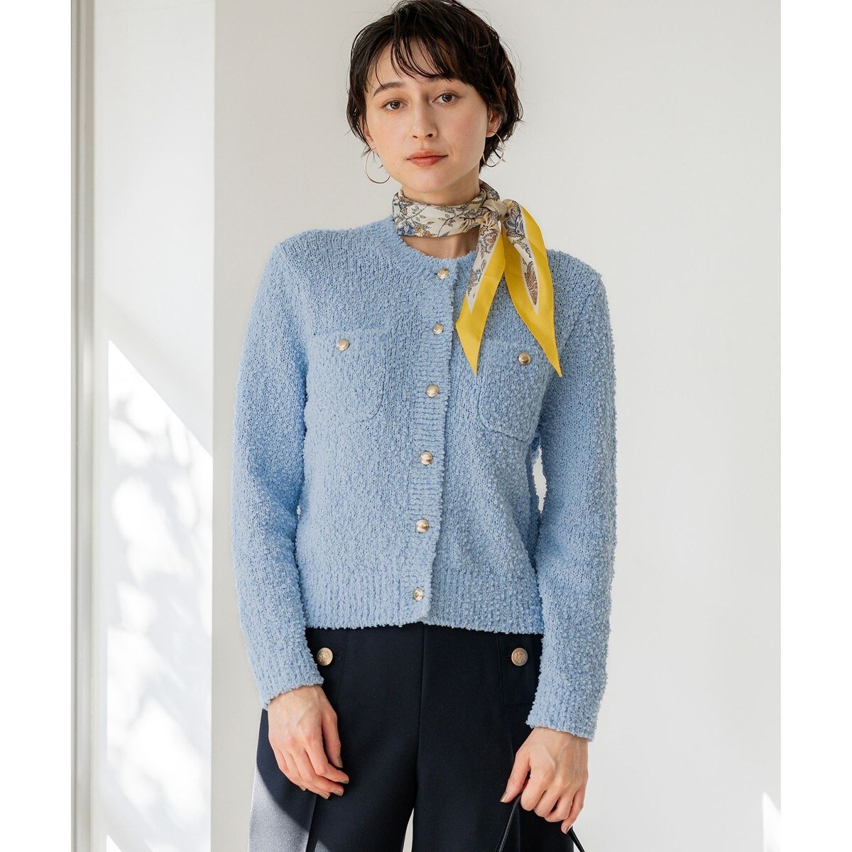 程よくしっかりとした編み地で、ツイードのような表情が魅力のニットカーディガンです。イタリア糸ならではの豊かな風合いと、ふっくらとした立体感が特徴で、羽織るだけで着こなしに存在感をプラスします。ゴールドのボタンと胸元のポケットがアクセントになり、上品で高級感のあるデザインに仕上げました。コンパクトな丈感は、ワンピースやスカートとの相性も抜群。オフィススタイルにはもちろん、デニムやワイドパンツと合わせてカジュアルダウンしたり、きれいめなボトムスと合わせればお食事会などのお出かけにも活躍する、着回し力抜群のアイテムです。カラーは、優しく上品な印象を与えるアイボリー(#002)と、空のように爽やかで華やかなスカイブルー(#072)の2色展開です。