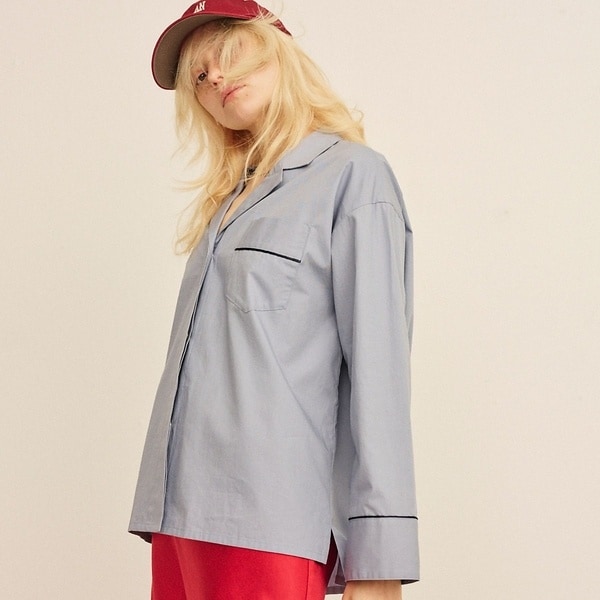 パジャマ風こなれ:前ボタンを少し開けて、袖をロールアップして抜け感を強調。