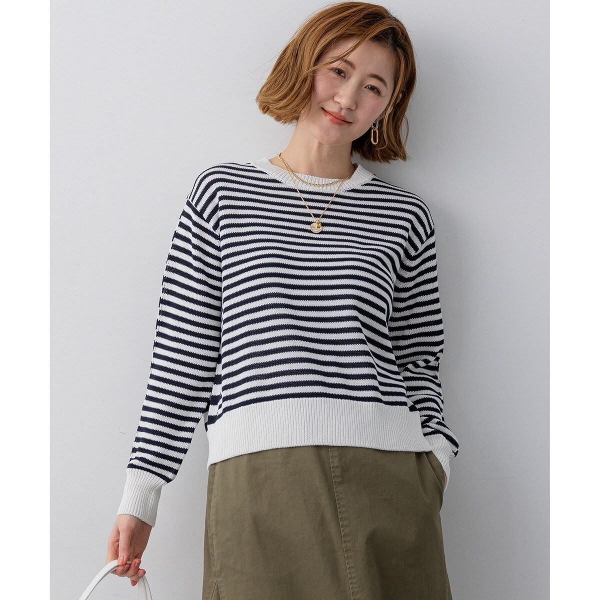 程よい抜け感のあるサイジングとシンプルなクルーネックのニット。肌寒い時季に嬉しい適度な肉感がありながらも、肌映りの良い質感で、春の訪れを感じさせる軽やかな印象を与えます。美しい発色を活かしたシーズンカラーと、着こなしのアクセントになるピッチ違いのボーダー柄をご用意しました。一枚でさらりと着るのはもちろん、コートの肩掛けでカラーをプラスしたり、シャツやカットソーとのレイヤードスタイルも楽しめます。カラーは、やさしい印象のライトイエロー(#042)、華やかなピンク(#012)、爽やかなスカイブルー(#072)、シックなオフ×ネイビー(#101)のボーダー、そして上品なライトイエロー×スカイブルー(#142)のボーダーの5色展開です。