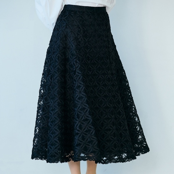・チュールの上にフラワーモチーフのテープ刺繍を施した立体感のあるリッチなスカート。