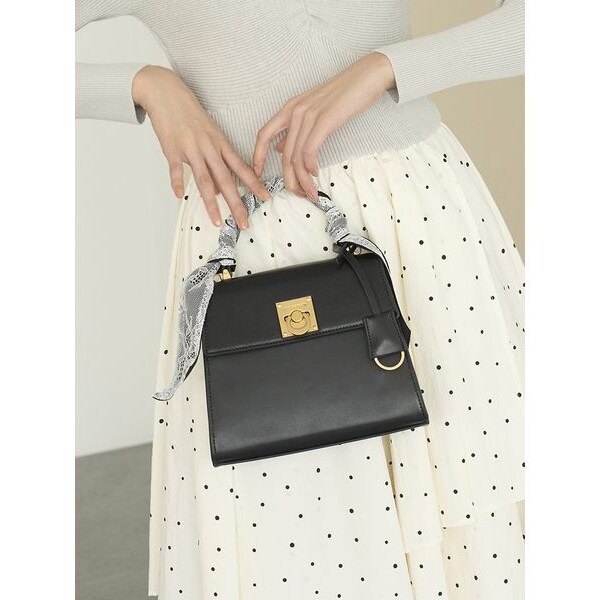 四つ角のスタッズでスパイスを効かせたヴィンテージ調のオリジナルキーパーツがクラッシックなバッグ。リッチな雰囲気を纏うカーフ調スムースフェイクレザーを使用し、上品さと扱いやすさを両立しました。付属のレーススカーフは、ハンドルに巻いたり結んだりとアレンジ自在で、コーディネートに合わせて表情を変えられるのも魅力。ショルダーは少し短めに設定し、持つだけでスタイルアップが叶う絶妙なバランスに。コンパクトながら、お財布・携帯・+αがしっかり入るデイリー向けの収納力を確保。内側・外側には便利なポケット付きで、機能性も抜群。オンオフ問わず活躍する万能バッグです。