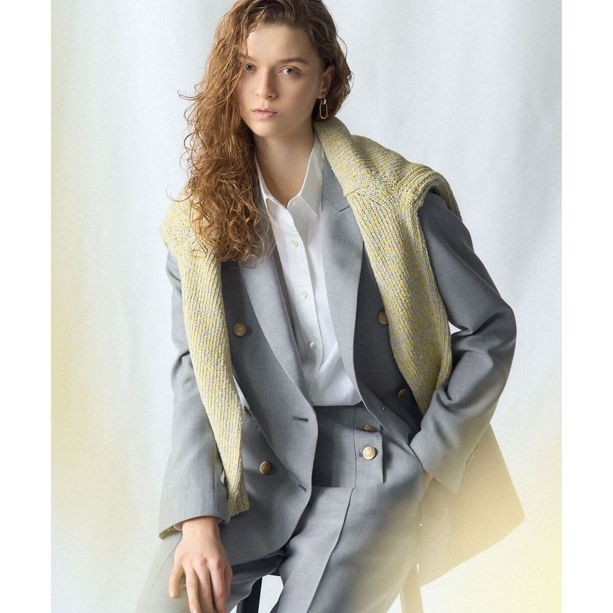 ハンサムかつエレガントさが際立つ、ダブルフロントのテーラードジャケット。マニッシュな印象ながら、オーバーサイズ過ぎない絶妙なシルエットに仕上げています。ゴールドボタンや袖裏のストライプなど、細部にもこだわりを持たせた1枚です。シャツを合わせてフォーマルにも、Tシャツを合わせてカジュアルにも着こなしていただける、多彩なスタイリングが叶うアイテムです。カラーは、深みのある上品なネイビー(#075)と、洗練された印象を与える明るいライトグレー(#003)の2色展開です。