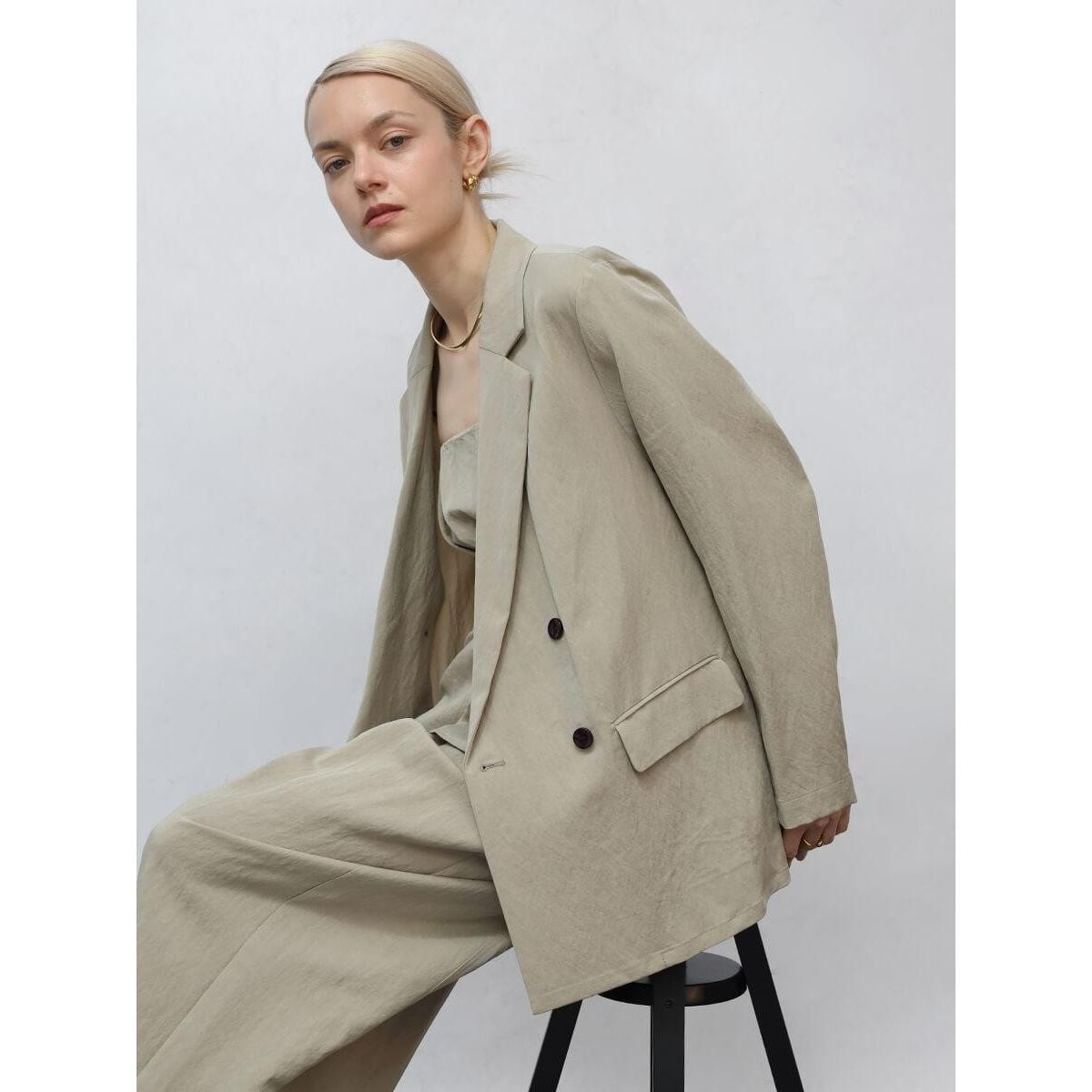 セルロースとキュプラをベースとした、しっとりとした質感とさらっとした着心地が特徴の混紡素材。なめらかな表面と美しいドレープ性も特徴的。型崩れしにくい点もポイントです。