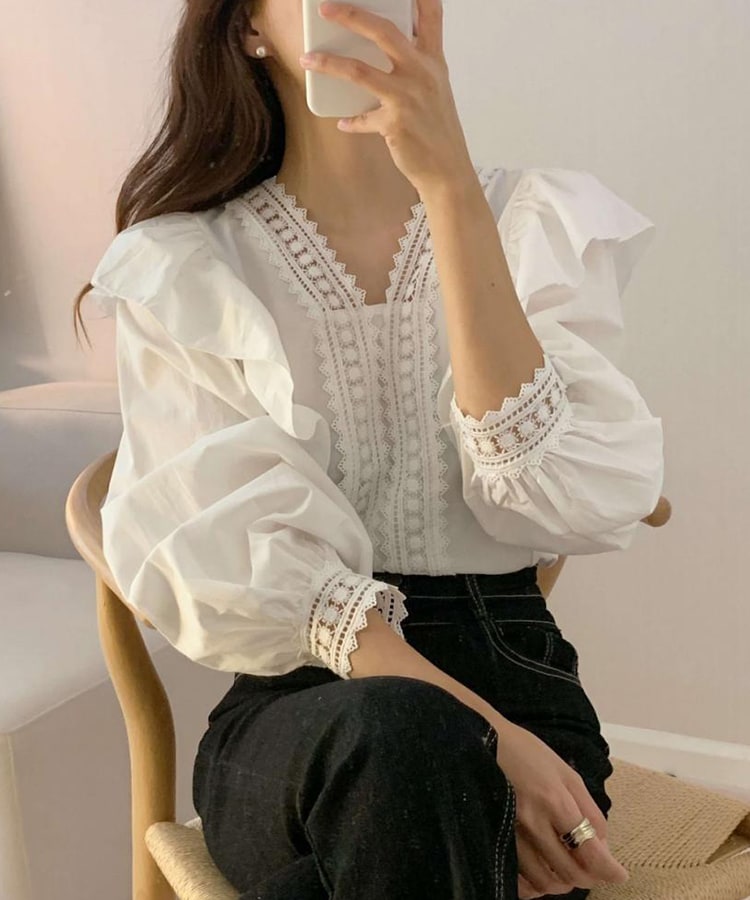 繊細なレース使いと立体感のあるフリルが目を引くブラウス。