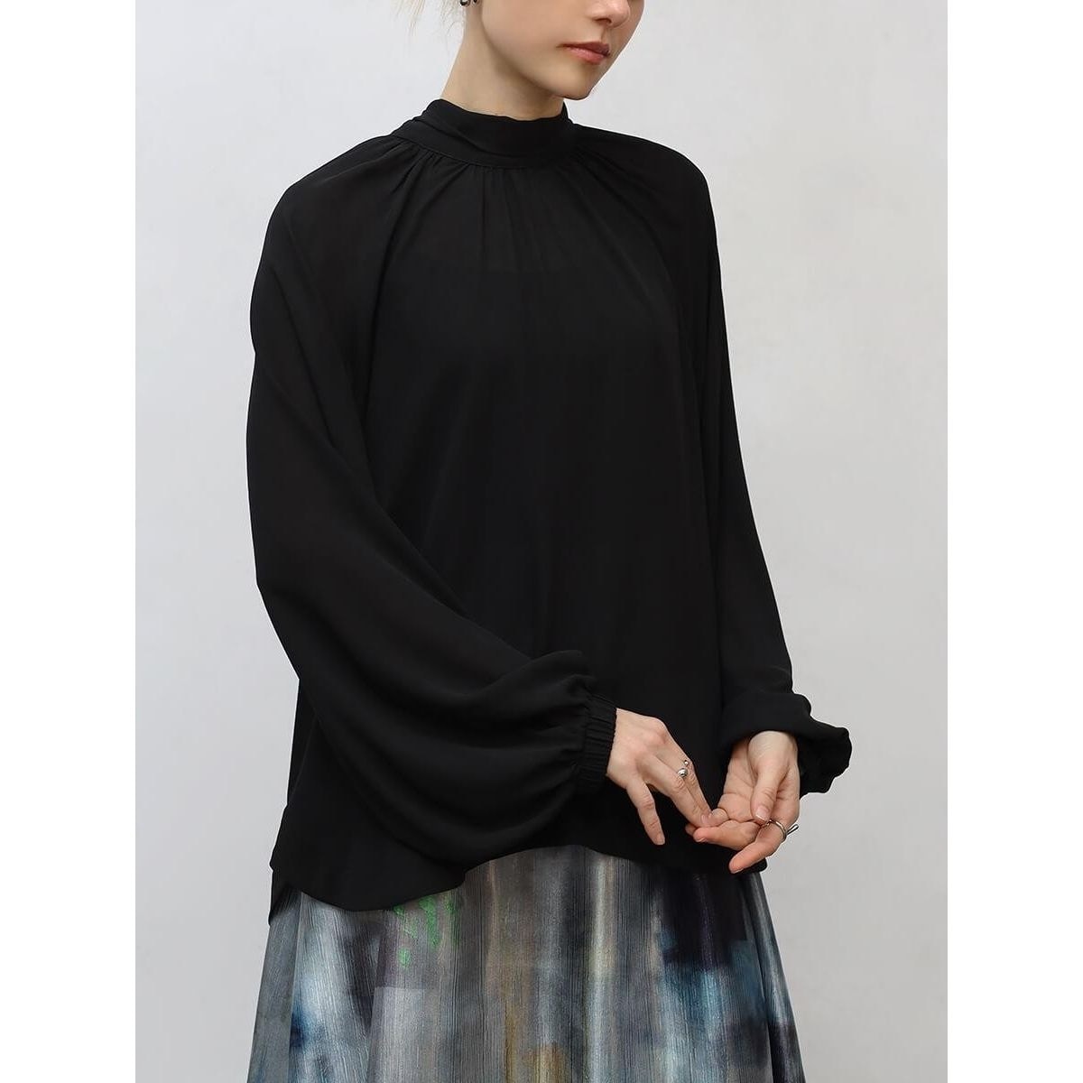 軽やかでさらっとした質感が着心地の良さを後押しするポリエステル素材。美しいドレープ感とほのかな光沢感が大人上品な印象に。薄手ながらシワになりづらいため長時間の着用も気兼ねなくお過ごしいただけます。