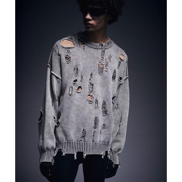 アシッドウォッシュ加工と大胆なダメージ表現が目を引く存在感抜群のクルーネックトップス。