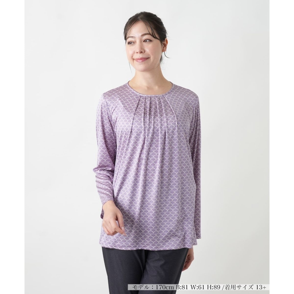 どこか懐かしさを感じさせるレトロ調の柄をプリントしたクルーネックカットソー。ネック周りには放射状に広がるようなタックをあしらい、ドレープ感のある柔らかなニュアンスに。すっきり見えするシルエットには程よくゆとりをもたせ、肩肘張らないリラクシーな着心地を叶えました。バックネックの涙あきはボタンにより開閉が可能。一枚での着こなしはもちろん、ジャケットやコートのインナーとしても活躍するアイテムです。