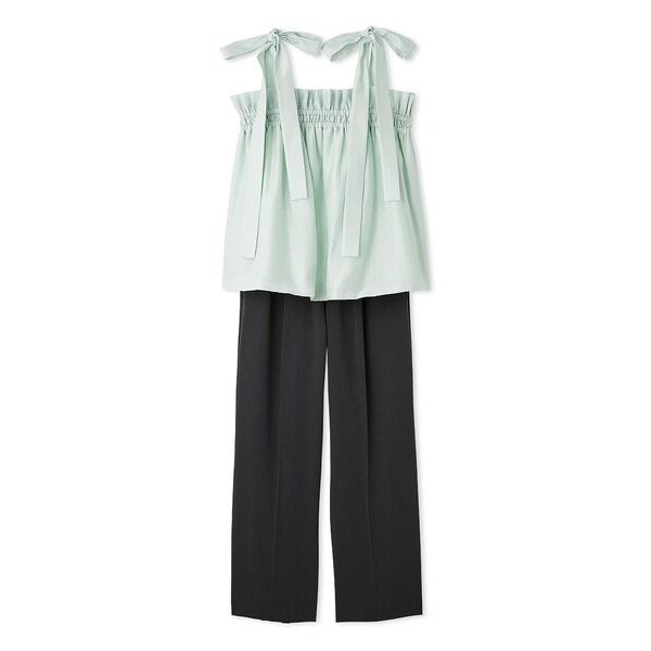 華やかで着映えするリボンディティールのキャミブラウスと、ウエストゴムのキレイめワイドパンツ、2枚がSETになったうれしいアイテムです。