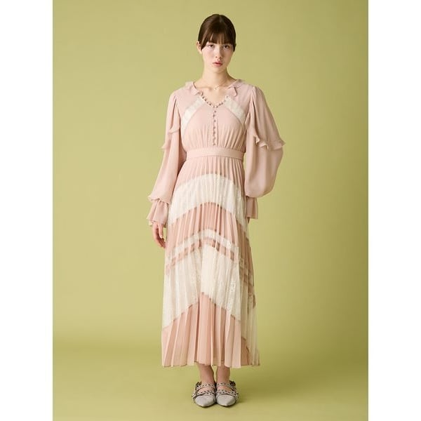 レースとシフォン素材をカーブ状にはぎ合わせ表情豊かに仕上げたドレス。スカート部分にはプリーツ加工を施し、立体感とソリッドさをプラス。袖はたっぷりギャザーを入れ、シフォンの特性を活かしたふんわりシルエットに。衿周りから前身頃にかけて密度高めに配置したボタンでトレンド感を演出しました。衿と袖の端始末には切りピコを施して細部まで繊細さにこだわった一着。