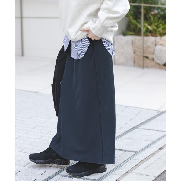 後ろゴムのウエストで楽に着られ、程よく広がるフレアシルエットや落ち感のある風合いが魅力。