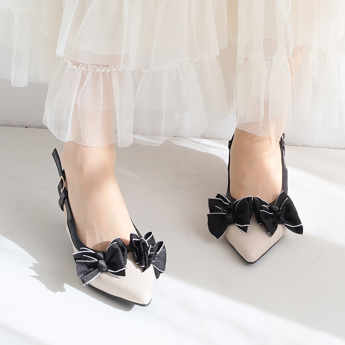・上品な素材と配色で目を引くリボンが足元を華やかに演出するスリングバックパンプス!
