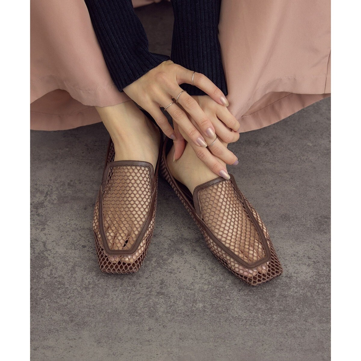スクエアトゥでモード感を演出したメッシュローファー。