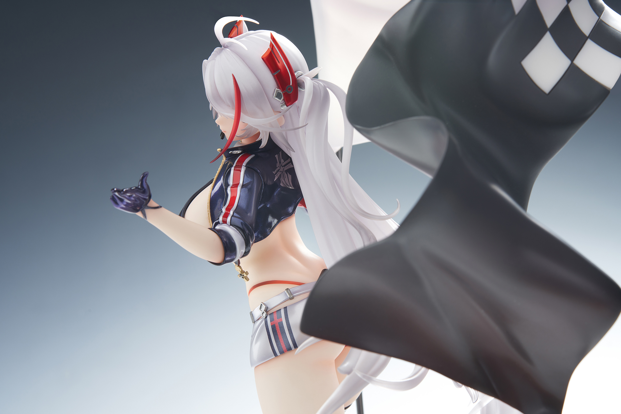 セクシーなレースクイーン衣装を身に纏った「プリンツ・オイゲン」が、あなたのゴールを心待ちにしています!チェッカーフラッグを掲げたエレガントな立ち姿は、今回のフィギュア化のためのオリジナルポージング。惜しみなく披露されたボディラインは否が応でも目を惹きます!