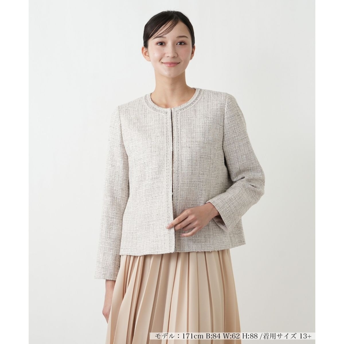 フランスの名門「RAPHAEL」社のファンシーツイードを使用した、格調高いノーカラージャケット。表情豊かなミックス調の糸で織り上げられた生地は、上品な凹凸感があり、セレモニーシーンにふさわしい品格を漂わせます。すっきりとした丸首のデザインが、インナーやアクセサリーを引き立て、着こなしの幅を広げてくれる一枚です。