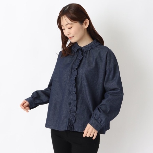 デニム素材でフリル付きなので甘くなりすぎず、前あきなので羽織としても着れる着回しのきく1枚です。