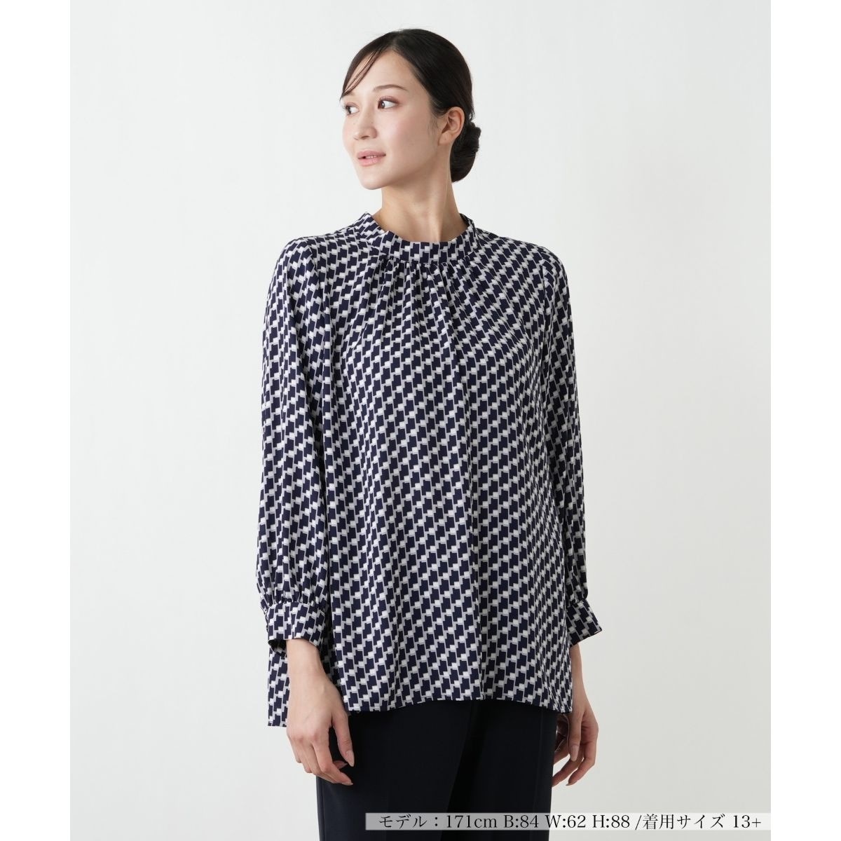 首元に細やかに寄せられたギャザーが、顔まわりに柔らかな立体感を演出します。全面にあしらわれた幾何学模様が、装いにモダンで洗練された表情を添えます。ゆったりとしたシルエットながらも、なめらかな生地が身体のラインに沿い、動きに合わせて美しいドレープを描きます。袖口にはシャーリングデザインが施されており、手元にさりげないアクセントを加え、全体的に上品な佇まいの一着です。