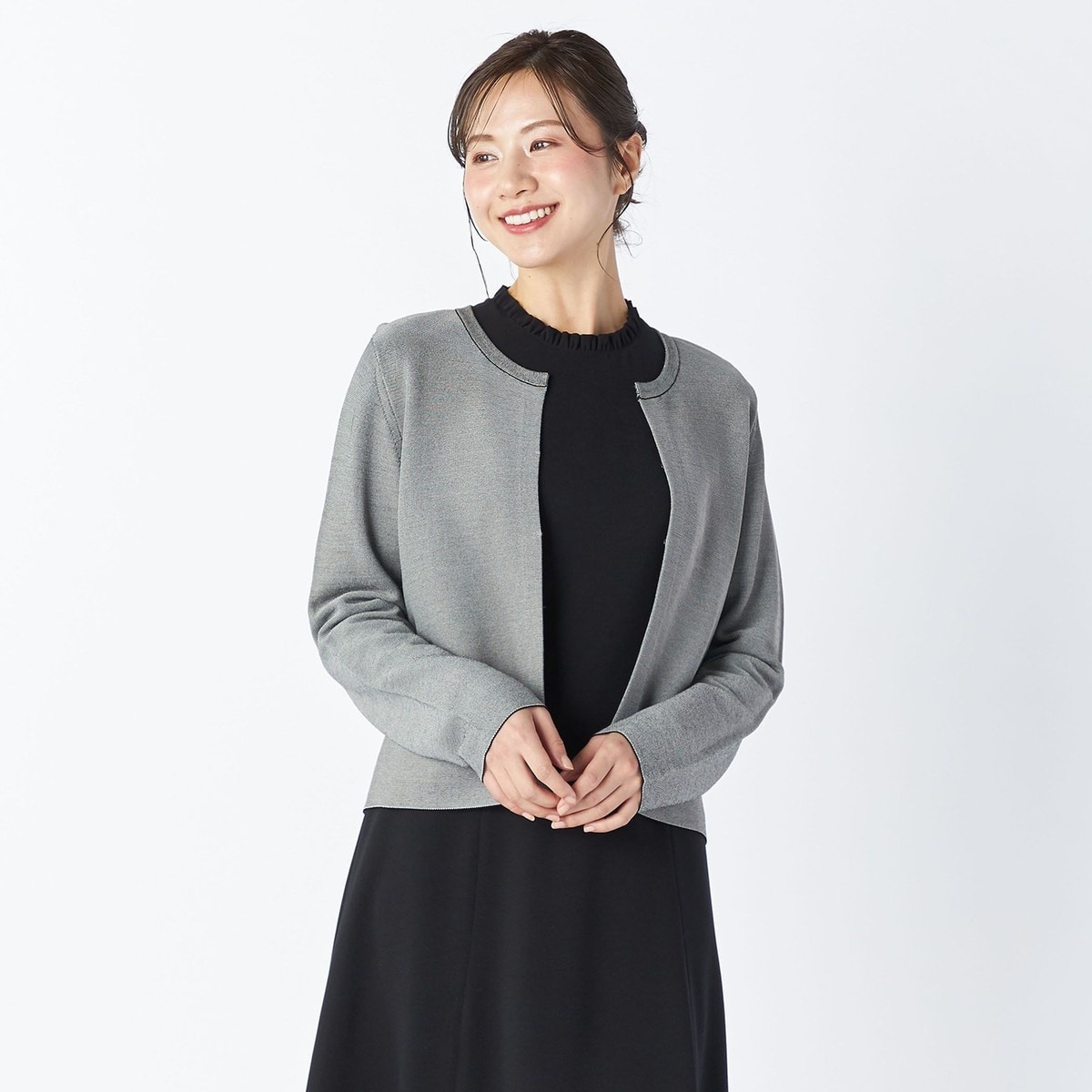 編み目の細かなツイードニット生地のノーカラージャケット。肌触りの良いレーヨン×ナイロン素材を使用しています。フロントはシンプルなホックボタン式で、ラインを配した首元がさりげないアクセント。通勤にジャケットとして着こなすのはもちろん、カーディガン感覚で日常スタイルに取り入れるのもおすすめです。