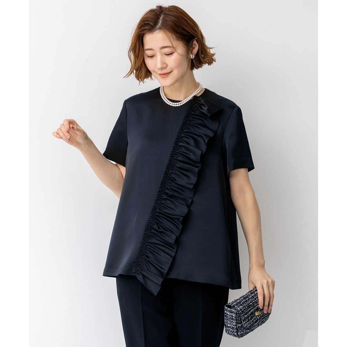 フロントのフリルデザインが印象的な半袖ブラウス。シンプルなデザインながら存在感のあるフリルディテールにより華やかさを加えたデザイン。ゆったりとしたシルエットで体型をカバーしながら、セレモニースタイルをモードな雰囲気に昇華してくれる1着です。同素材のパンツ(品番: PRAPGS0727)とあわせたり、お手持ちのボトムとの着回しもお楽しみいただけます。カラーはシックな雰囲気を醸し出すブラック(#005)と、華やかさの中にも品を感じさせる濃いめのネイビー(#075)の2色展開です。