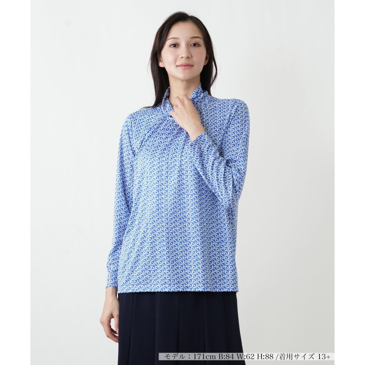 ジャケットのインナーに最適な、ジオメトリックプリントのハイネックカットソー。なめらかでシワになりにくいジャージー素材を使用しており、快適な着心地が続きます。首元をすっきりと見せるハイネックデザインは、アクセサリーとの相性も良く、顔周りを上品に演出。一枚重ねるだけで、いつものジャケットスタイルを新鮮に見せてくれる便利なアイテムです。