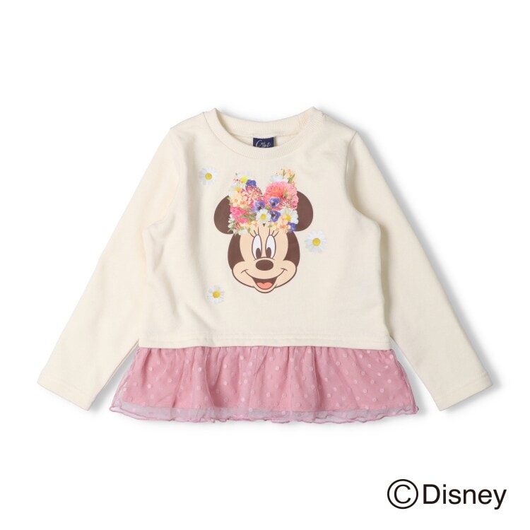 【Disney】人気のディズニーデザインアイテム。お花がいっぱいのリボンを付けたミニーマウスのプリントが可愛い!!裾のドット柄のチュールの切替もガーリーなトレーナー、スウェット。秋から春まで着られる裏毛素材。(ベビーサイズのみ肩ボタン仕様になります。)【アイテム】トップス シンプル ガーリー フェミニン カジュアル お洒落 オシャレ かわいい 可愛い 普段着 デイリーウェア お出かけ着 お外着 お外遊び着 子ども こども 女児 女の子 ガールズ キッズ ベビーサイズ トドラーサイズ 幼稚園 保育園 小学校 通園 通学 小学生 2026年春夏物新作 丸高衣料 ロングスリーブ 長袖 キャラクター オフホワイト 白色 ラベンダー 薄紫色 クレセント コットン100% 綿100%