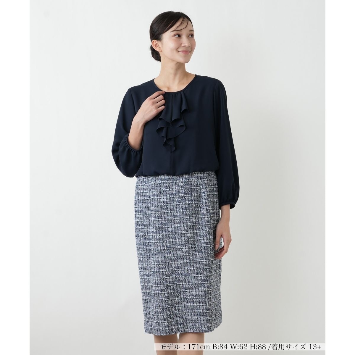 ブラウスとスカートをコーディネートしたかのような、ドッキングデザインのワンピース。一枚で装いが完成する手軽さながら、きちんと感のあるエレガントなスタイルを叶えます。ジャケットを羽織っても首元のフリルが華やかさを演出し、セレモニーシーンに最適。忙しい朝にも頼りになる、デザイン性と着心地の良さを兼ね備えた一着です。