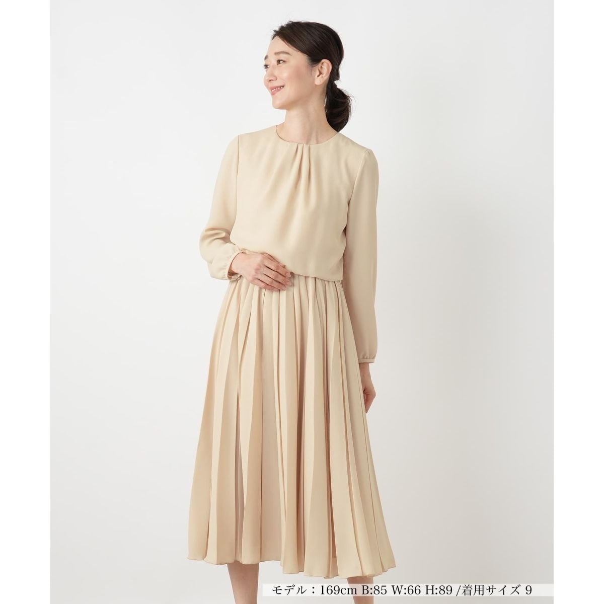 優しく華やかなイエローベージュが目を引くワンピース。襟元のデザインと軽やかなプリーツスカートが、エレガントな印象を与えます。一枚着はもちろん、ジャケットを羽織っても品よくまとまる、セレモニーにも最適な一着です。