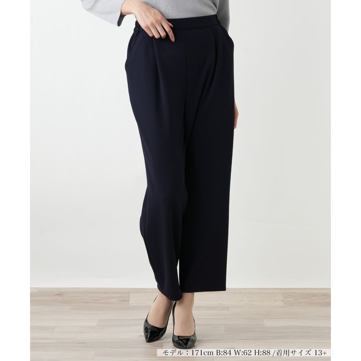 フロントに深く入ったタックが、腰まわりに心地よいゆとりを与えつつ、縦のラインを強調し、洗練された印象を演出します。しなやかながらもハリのある生地は、美しい落ち感を生み出し、脚のラインをすっきりと見せるストレートシルエットを際立たせます。ウエスト周りはフラットに仕上げられており、トップスのインスタイルも美しくまとまります。足首がのぞく丈感で、軽やかな抜け感を添え、様々なトップスとの組み合わせを楽しめる一着です。