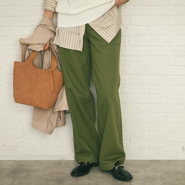 Aラインシャツ(商品番号:153-85206)やシャーリングフリルネックブラウス(商品番号:153-86214)などのストライプのトップスとのコーデがおすすめです。