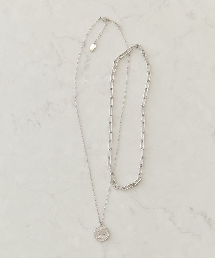 重ねるだけで、単品でも旬顔になれる2連ネックレス程よい存在感のコインモチーフと、表情の異なるチェーンを重ねたデザインです。一本でレイヤードスタイルが完成するため、コーディネートに迷う日もさっと取り入れやすいのが魅力です。ステンレス素材を使用しているため、日常使いしやすく、お手入れの手間が少ないのも嬉しいポイントです。カジュアルな装いには程よいアクセントを、きれいめスタイルには抜け感を添えてくれます。トップスの襟元を選ばず合わせやすく、Tシャツからニット、ワンピースまで幅広く活躍します。単調になりがちな装いに奥行きをプラスし、自然と旬な雰囲気を演出してくれる一本です。デイリーからお出かけまで、長く愛用できるアイテムです。※モデル着用画像は、光の当たり具合で色味が違って見える場合がございます。※お使いのモニター環境によって商品の色味が違って見える場合がございます。