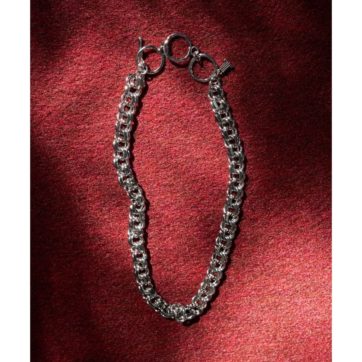 太さの異なるチェーンが絡み合ったようなデザインのネックレス。
