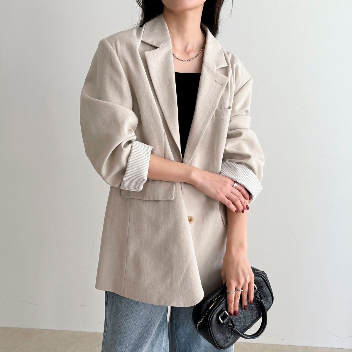 ・リネン混のラチネ素材を使用した、軽やかな着心地のオーバージャケット