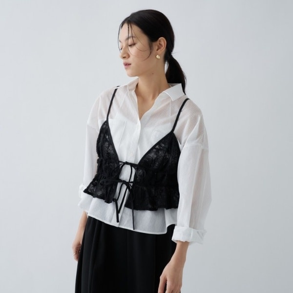 ・程よいシアー感でレイヤードしても主張しすぎず、洗練された印象に仕上がるレースビスチェ。