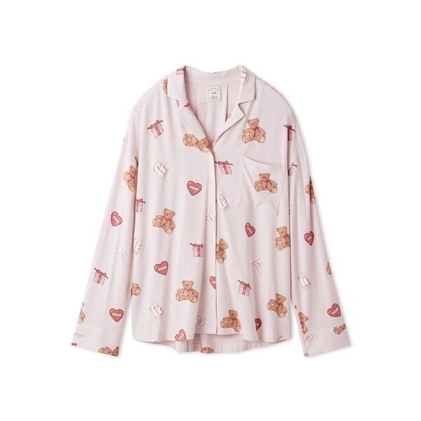 お気に入りのベアのぬいぐるみと暮らす、女の子のキュートなお部屋をイメージしたプリントカットソーのシリーズです。ベアのぬいぐるみとギフトボックス、ハートのクッション、雑誌から切り抜いた『P』と『G』を総柄プリントした開襟シャツ。裾に前後差を付けて、ゆるっと可愛く着用いただけるシルエットに仕上げました。これからのホリデーシーズンにも似合うハートフルな柄と、袖口に施した手書き風のロゴ刺繍がポイントです。色は優しいオフホワイトとピンクの2色展開。同シリーズのロングパンツに合わせたり、お揃いの柄を使用したベビモコ素材のベアさがらシリーズと合わせるのもおすすめです。