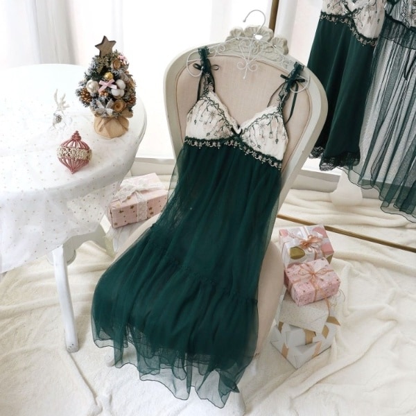 キラキラと揺れるオーナメントをモチーフにした、リサマリのクリスマスコレクションです。レースには窓辺に飾られているリボンやモミの木、ベルや鈴をふんだんに刺繍して、オーナメントがゆらゆらと揺れている様子を可愛らしく表現。窓の外に降り積もる雪の結晶を、たっぷりのラメ糸で豪華にあしらいました。カップ上辺はシンプルなレースで2段になるよう切り替えて、刺繍1つ1つを引き立たせるナチュラルな上品さを演出。バスト下には存在感のあるケミカルナローレースを、ストラップにはチュールとアップリケ、背中側には結べるサテンリボンを添えて、ホリデー気分高まる特別感をプラスしています。身生地にはふんだんにチュールを使用して、ふんわり揺れるシルエットとアシンメトリーな切り替えデザインで、マキシワンピースだけの華やかなスタイルに仕上がりました。年に1度のクリスマスシーズンは、Risa Magliのランジェリーでヒロインに。心ときめく素敵なひと時をお過ごしください。