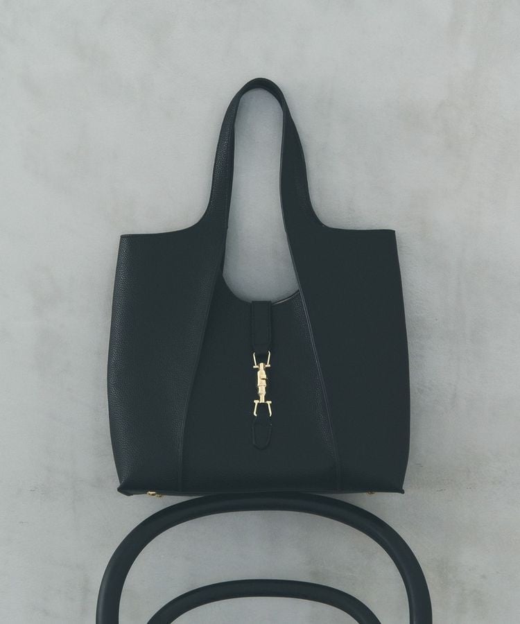 装飾を控えたミニマルなデザインに、ゴールドの金具がアクセントに光るトートバッグ。