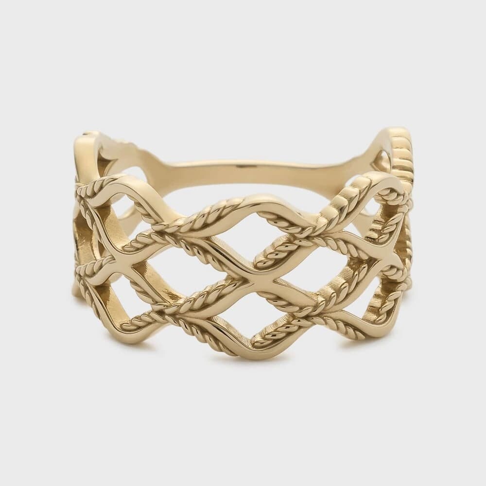 【Soft Gold Series】バスケットをイメージして抜け感たっぷりにデザインした透かしのリング。プレーンな線とツイストの線で柔らかく編み込まれたシルエットは、少しだけ歪なクラフト感を添えて優しい印象に仕上げました。幅がありつつも軽やかなボリュームは、細身のリングとのコーディネートにもおすすめです。※天然石や天然素材を使用しているものは、サイズ・色味・風合いの違いや、若干の傷、内包物の有無などに個体差があります。予めご了承ください。※肌なじみのいいソフトゴールドカラーのコーティングを使用しています。