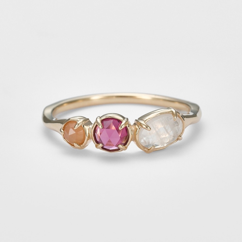 サイズの異なる3つの天然石を連ね、流れるようなラインを描くフォルムが魅力のリング。存在感のある石使いと、繊細なニュアンスを持つテクスチャ入りのアームが絶妙なバランスで、指先に軽やかな華やぎを添えます。ガーネット・ホワイトラブラドライト・ピーチムーンストーンの組み合わせは、柔らかくあたたかみのある色合いが特徴です。シンプルでありながら新鮮なカラーハーモニーを楽しめ、1本でも重ね着けでも、手元に優しい輝きをもたらします。※天然石や天然素材を使用しているものは、サイズ・色味・風合いの違いや、若干の傷、内包物の有無などに個体差があります。予めご了承ください。※サイズ直しプラスマイナス2号迄。