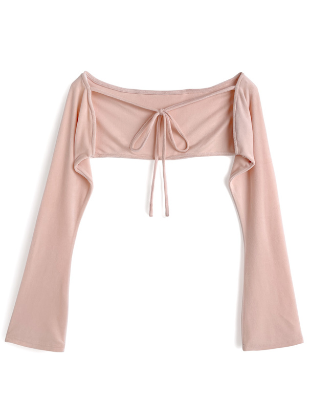 胸元のリボンディテールやフレアスリーブで甘さを加えたボレロ。