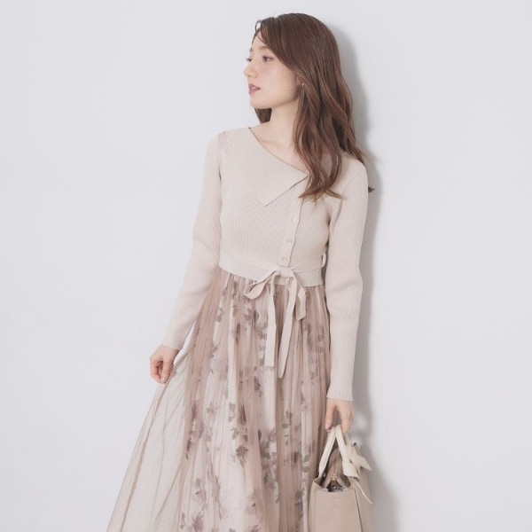 ・軽やかなチュールを重ねた花柄スカートが足元をふんわりと包み込み、品の良い動きを演出。