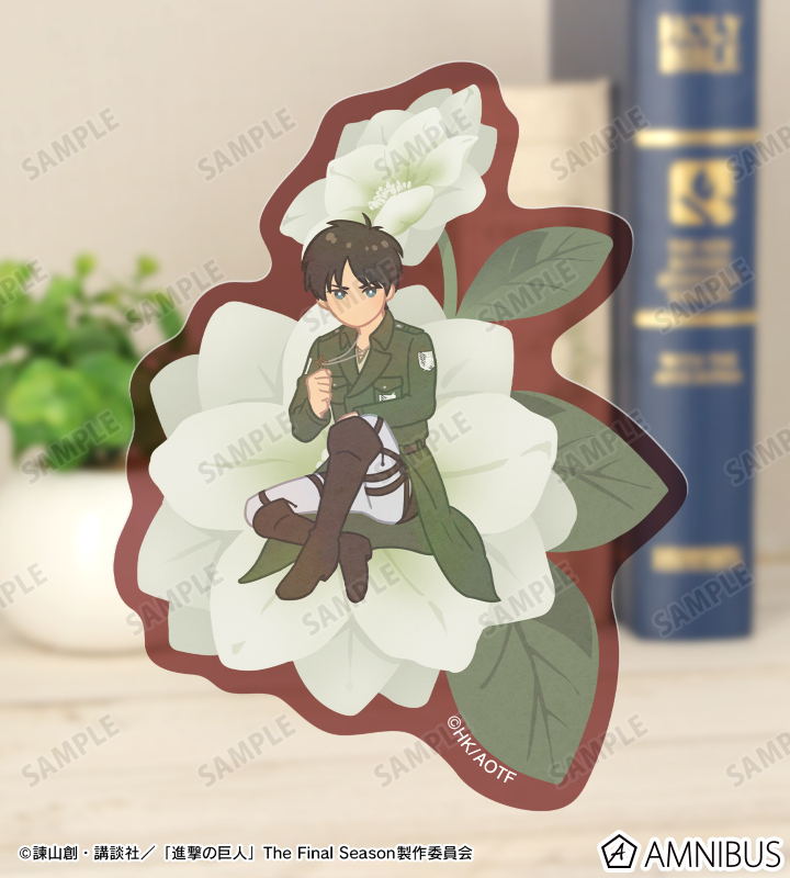 エレンのイラストをボタニカルデザインに落とし込んで繊細なタッチで新たに描き起こし、ダイカットのクリアステッカーに仕上げました。