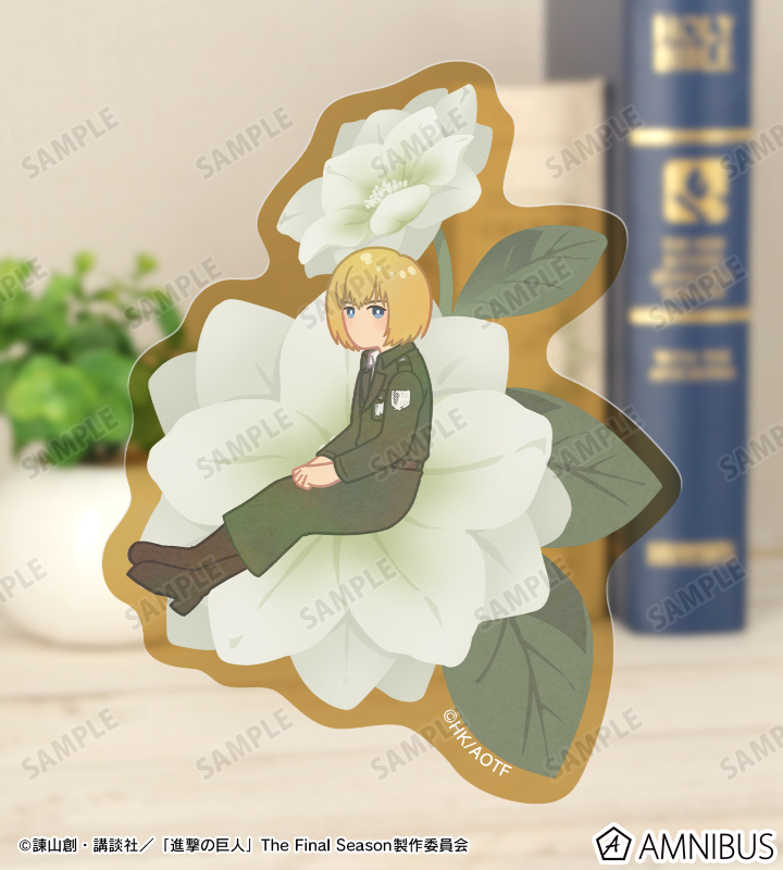 アルミンのイラストをボタニカルデザインに落とし込んで繊細なタッチで新たに描き起こし、ダイカットのクリアステッカーに仕上げました。