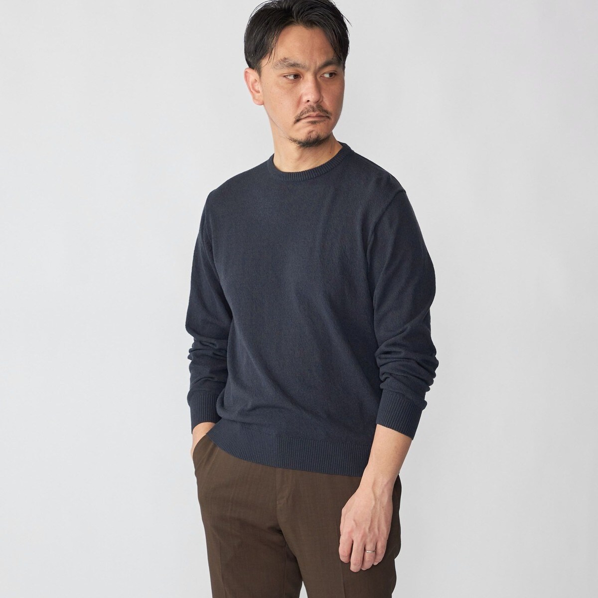 癖のないクルーネックニットはシーンやスタイリングを問わずにお使いいただけます。