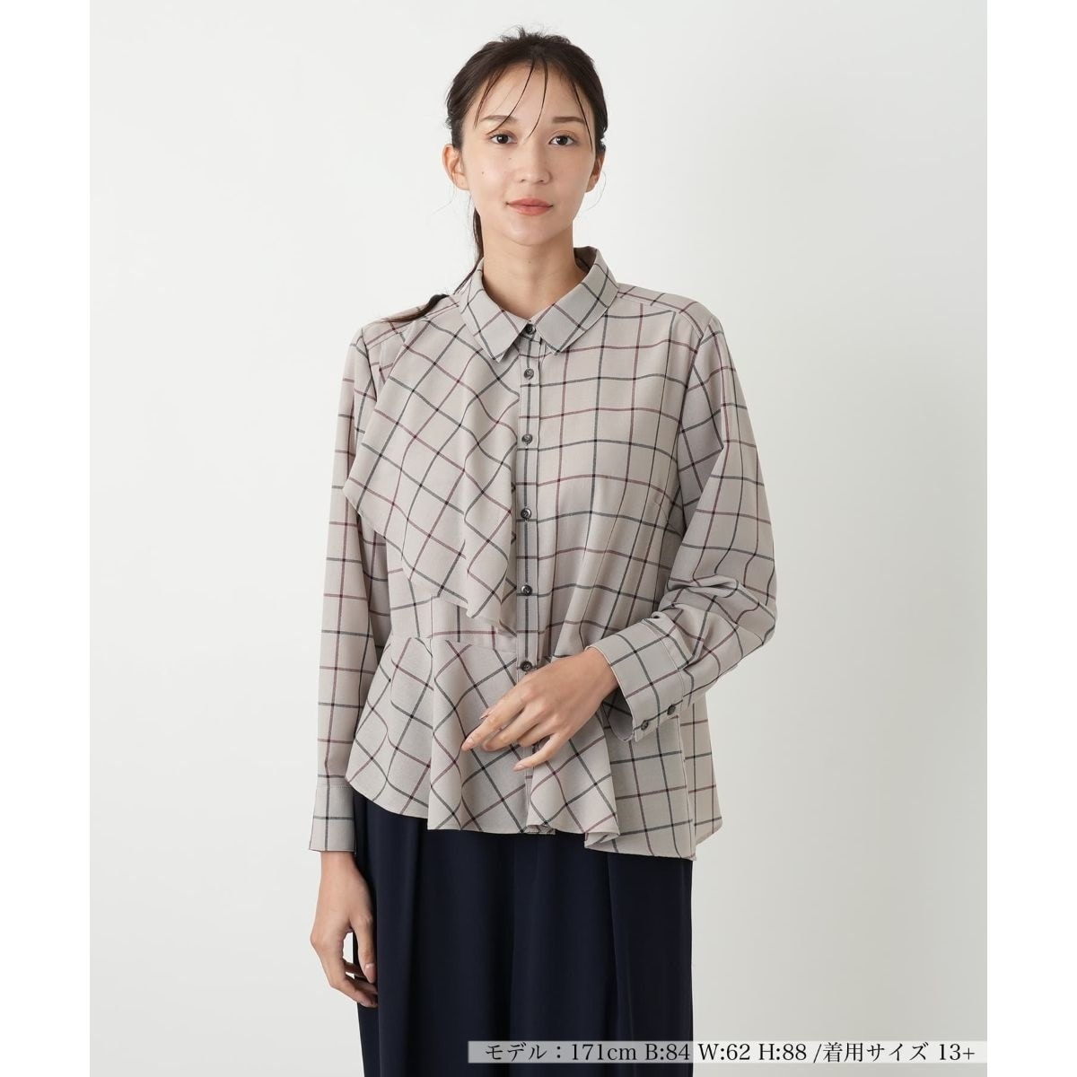 秋らしいチェック柄が目を引く、スタンドカラーシャツブラウス。ポリエステルとレーヨンをブレンドした素材は、柔らかな肌触りと適度なハリ感を兼ね備えています。チェック生地をアシンメトリーに配したデザインが、モダンで洗練された印象を与えます。スタンドカラーと長袖のデザインが、大人の女性の品格を一層引き立てます。ご自宅で手洗いできるウォッシャブル仕様で、日常のお手入れも簡単。一枚で着ても華やかな存在感を放ち、ジャケットやカーディガンのインナーとしても上品に映えます。秋のコーディネートに上品さと個性を添える、着回し力の高い一枚です。