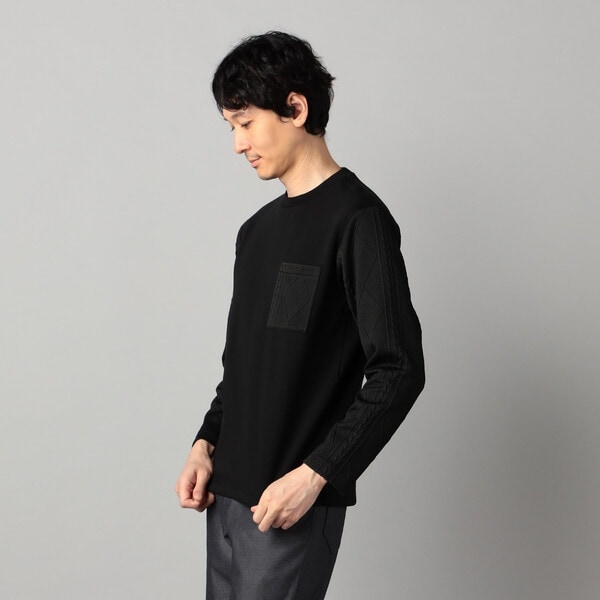 ダブルニットジャージーとケーブル柄を切り替えた、ポケット付きのプルオーバーです。