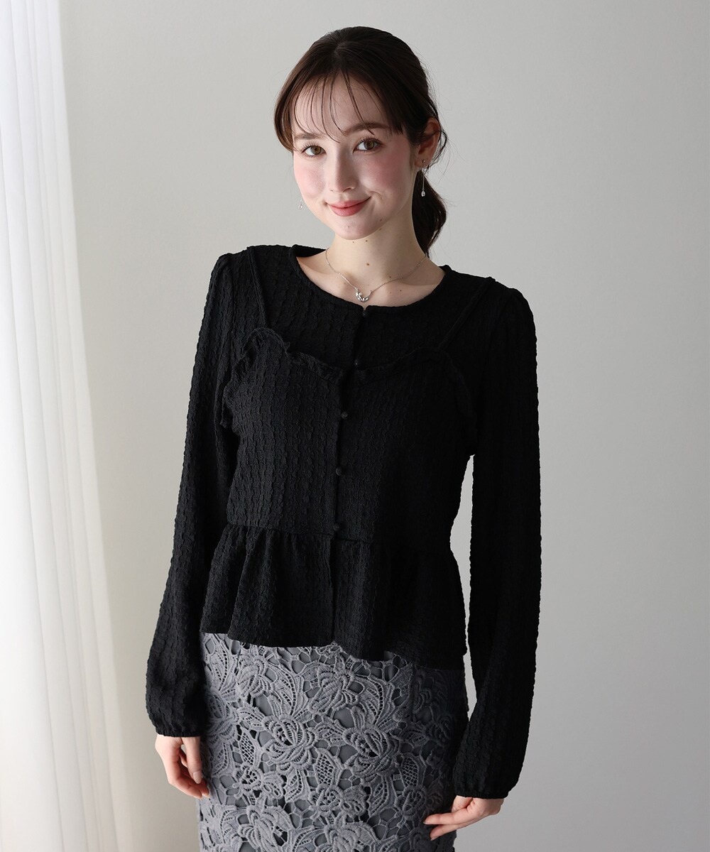 カットソーにビスチェをレイヤードしたようなデザインがシルエットにメリハリをプラス。
