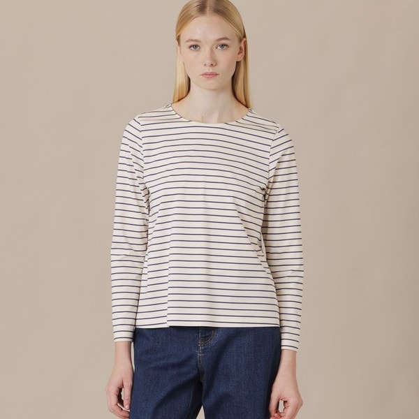 ボートネックのシャープなトップスです。軽い印象ながらエレガントなスタイリングに合う仕上がりです。裾、袖口は折り上げ接着する仕立てになっています。同素材の無地Tシャツ(品番:G5P26758)もご用意しております。