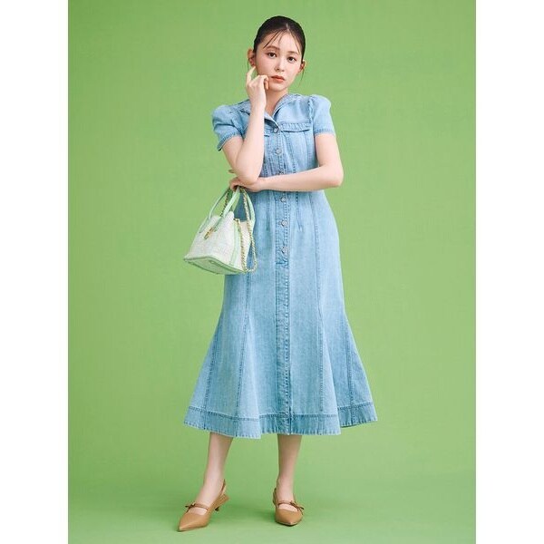 マーメイドシルエットがレディな印象に仕上がる、デニムワンピース。カジュアルなデニムアイテムに繊細な作りのビジュー釦を用いることでCELFOREDらしい上品さをプラス。